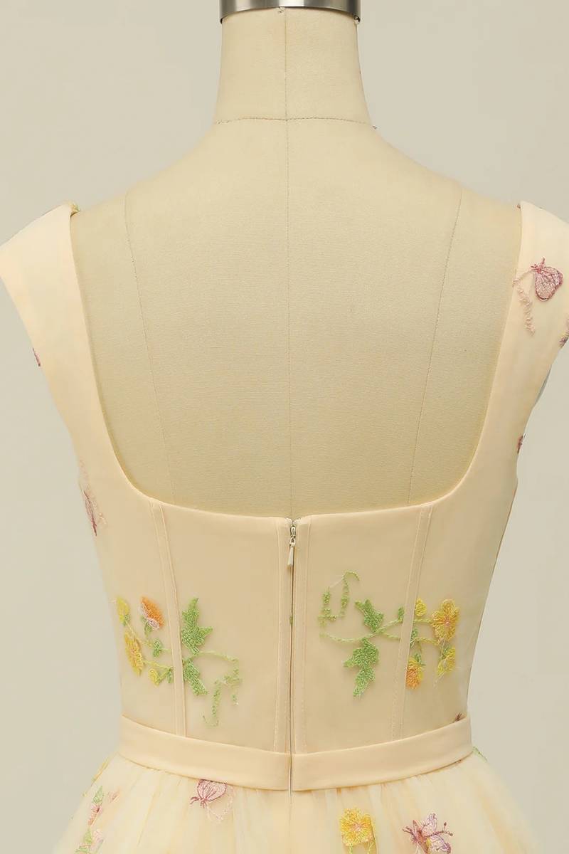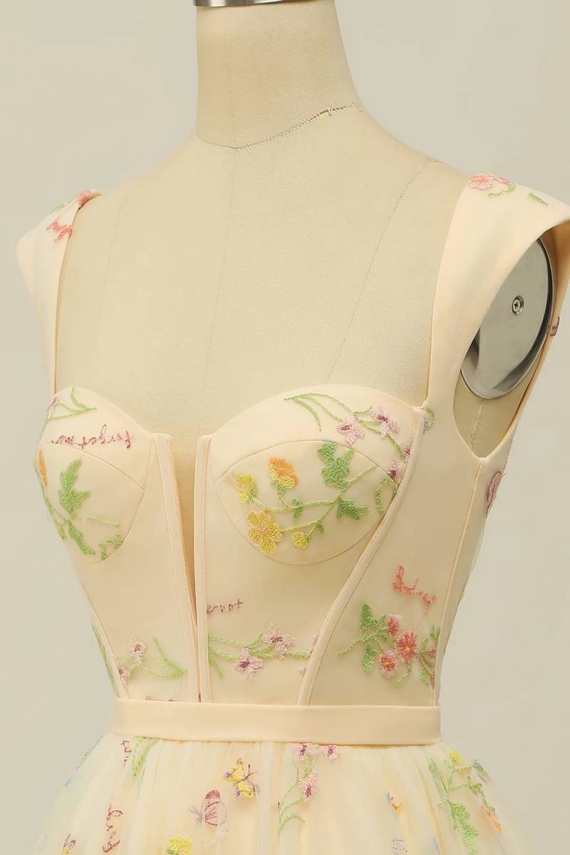 Details: The bodice is structured to provide support while maintaining a sleek look. The embroidery on the bodice and skirt includes a variety of colorful flowers and small motifs, adding texture and visual interest. The tulle skirt is light and airy, giving the dress a flouncy appearance. A thin waistband accentuates the waist, enhancing the overall fit.