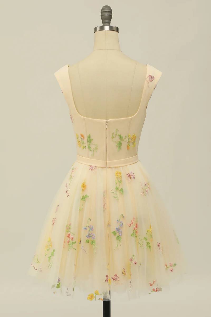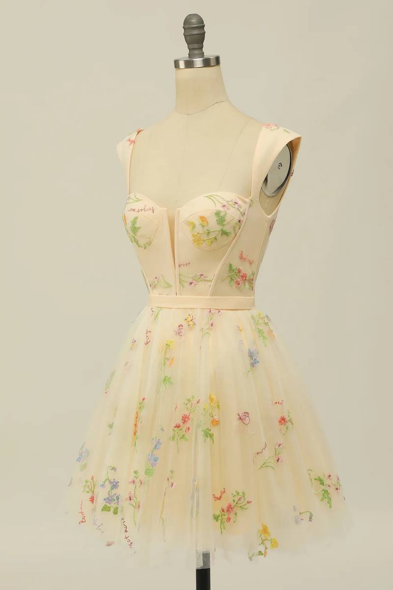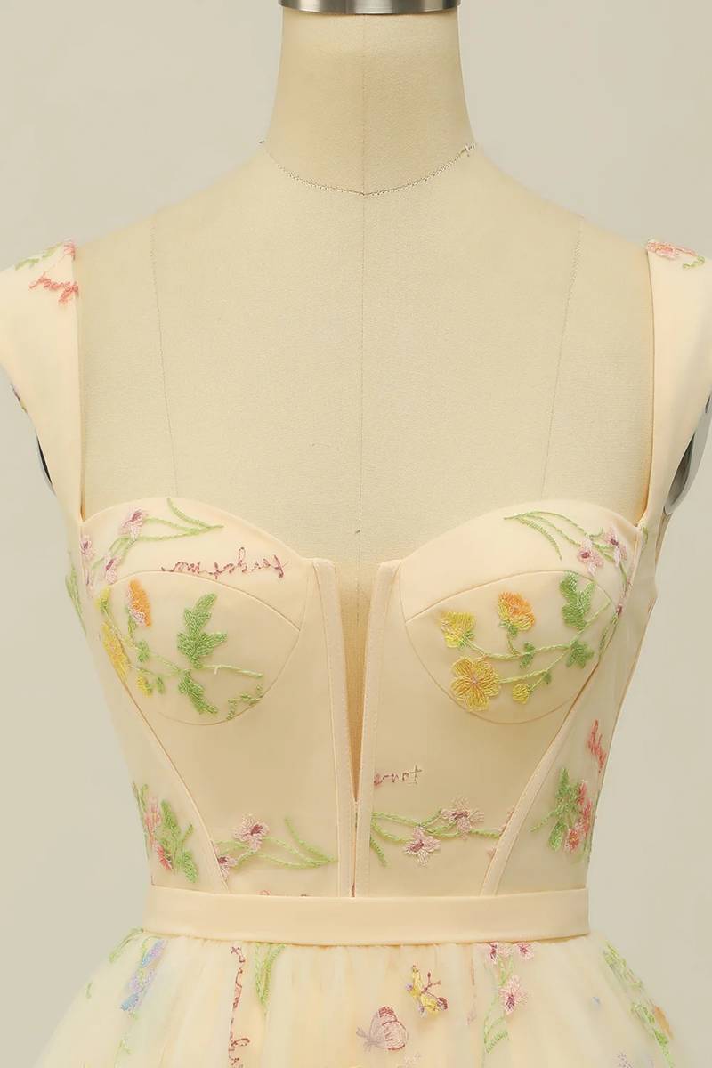 The dress features a strapless bodice with a sweetheart – like neckline that flatters the décolletage. The fitted bodice leads into a flared tulle skirt, creating a playful and feminine silhouette. The vibrant floral embroidery throughout the dress adds a charming and intricate detail.